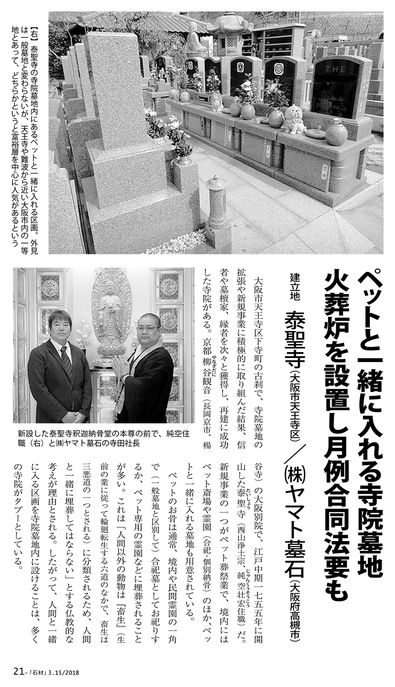 1月24日TV大阪『ニュースリアル』にて、 ペット葬儀需要に対して、火葬場施設設置トラブルについて、 法規制が整えられていないことへ 泰聖寺住職(てんのうじペット霊園)が取材対応しました。